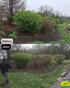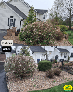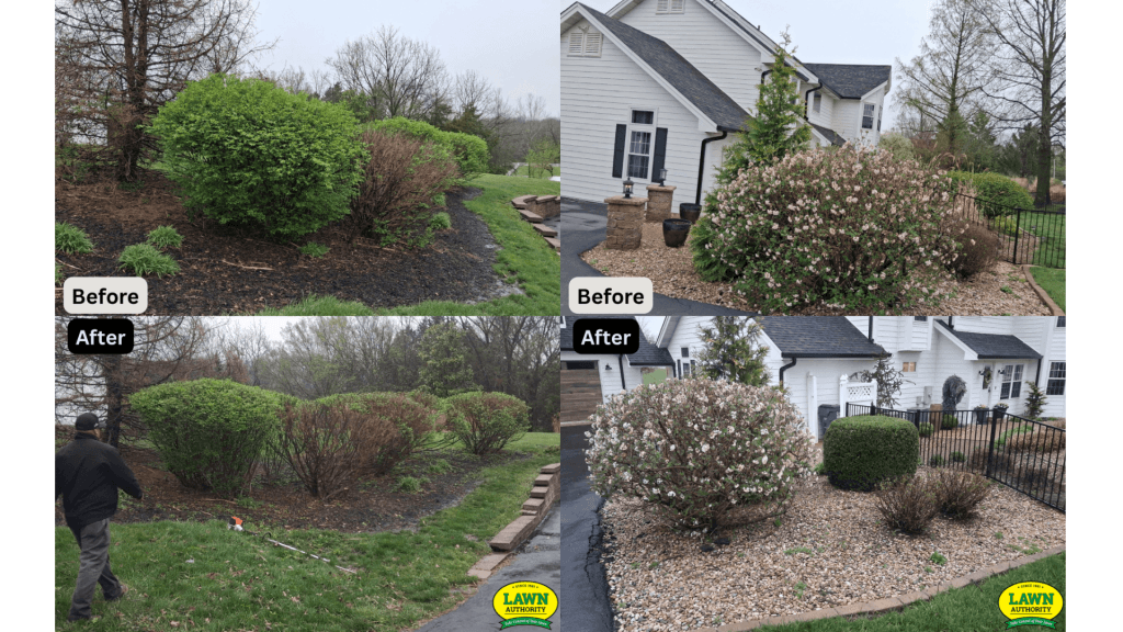 Before and after a professional spring lawn cleanup in Wentzville, MO—removing debris, redefining edges, and preparing the lawn for a healthy growing season.
